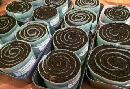 Wanneer alle zaden zijn geplant, blijft het alleen om het overtollige substraat af te snijden en de tape vervolgens in een strakke rol te rollen, die kan worden bevestigd met elastiek of tape.