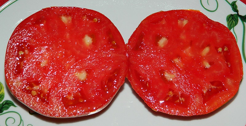 Uitstekende grootvruchtige salade variëteit, de smaak is geweldig, de pulp is sappig, dicht. De struik vormde 1 stengel, verschillende tomaten wogen tot 800 gram. Ik weet niet hoe het zich gedraagt tijdens conservering, omdat ik een paar struiken heb geplant om te testen. Volgend jaar zal ik meer planten, vooral omdat ik de zaden van de oogst heb verzameld.