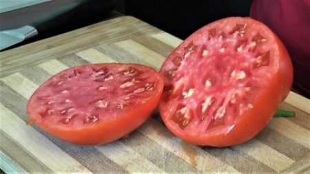 "Delicious" werd gekweekt in een kas, de vruchten zijn zeer groot, verzadigd van kleur, het vruchtvlees is sappig en smaakt goed. De grond in de kas werd gedesinfecteerd, gemorst met een hete oplossing van mangaan, wat waarschijnlijk de reden is dat de struiken geen pijn deden. Ik maakte tomatensalades, één was genoeg voor een salade voor het hele gezin, en bedekte het sap en de pasta. Ik was tevreden met de variëteit, het was niet tevergeefs dat mijn tijd en energie werden besteed.