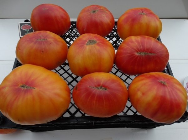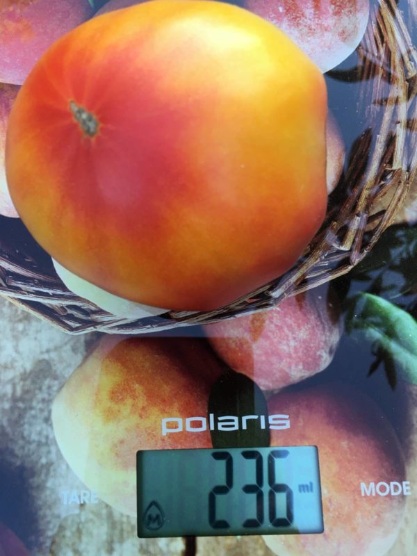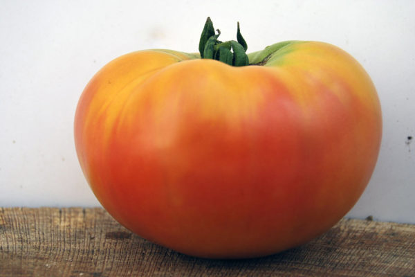 De vorm lijkt op een biefstuk. In het gebruikelijke geval bereikt het gewicht van de foetus 300-600 gram, maar er zijn uitzonderingen waarbij het tomatenfruit 900 gram kan bereiken. De kleur is helder en expressief, trekt het oog. Dit zijn verschillende tinten rood, geel en oranje. De schil van de tomaat is niet hard, van binnen is hij zacht, smakelijk en zijn er weinig zaden.