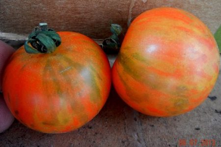 De variëteit Wild Tiger-tomaten werd gefokt door Amerikaanse kwekers. Trekt aan met zijn uiterlijk.