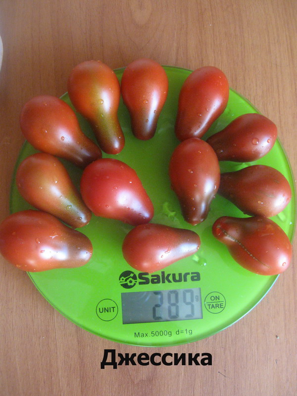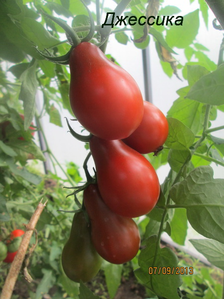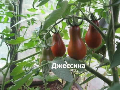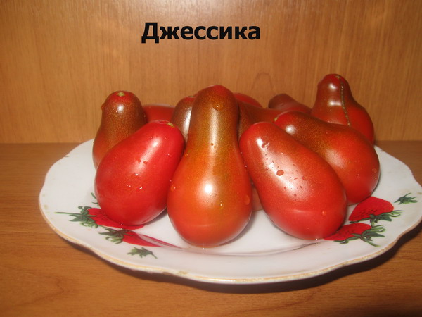De tomaat van Jessica heeft een vrij lange struik (van 1, 8 tot 2 m), dus deze moet worden vastgebonden en onnodige scheuten verwijderen. De bladeren hebben een donkergroene kleur, vorm zonder kenmerken. De vruchten rijpen in een bos en dragen fruit tot vorst. De vrucht is tweekamerig, heeft de vorm van een peer en heeft een donkere kersenkleur. Het gewicht van de vruchten is niet meer dan 100 g. Ook kenmerken de Jessica-tomatenvruchten een zoete smaak met een lichte zuurgraad, een vrij dichte structuur en een kleine hoeveelheid zaden.