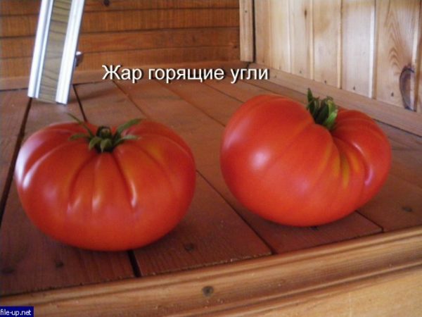 Dankzij de inspanningen van fokkers hebben boeren de mogelijkheid om veel interessante variëteiten te kiezen voor het planten op een zomerhuisje. Je kunt kiezen voor universele tomaten, die een hoge opbrengst kunnen geven in verschillende klimaatzones. Deze omvatten tomatenwarmte, brandende kolen, een beschrijving waarvan de kenmerken hieronder worden weergegeven.Te oordelen naar de foto's van tomatenrassen Warmte brandende kolen, de plant is krachtig. De teeltfuncties zijn duidelijk, zelfs voor beginners in de wereld van het planten van een thermofiele cultuur. Om deze reden kunnen tuinders met verschillende niveaus van ervaring en kennis een goed resultaat verwachten.