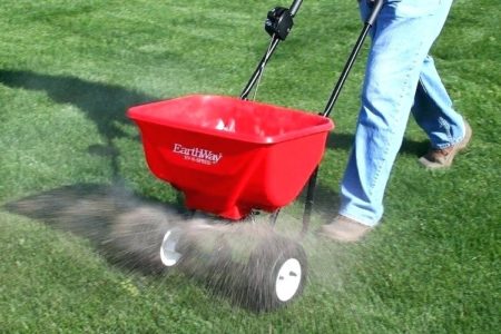 - Om planten te voeden, is het beter om speciale apparatuur te gebruiken. Dit voorkomt letsel aan de groene coating. Een strooier wordt gebruikt om het gazon te bemesten. Hij verkoopt in een gespecialiseerde winkel, waar de meststoffen zelf.