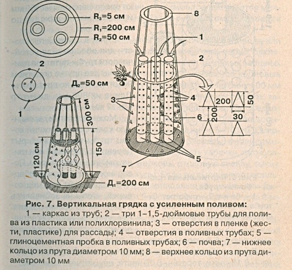 Een interessante versie van de verticale bedden voor komkommers. Voor het werk worden twee soorten buizen gebruikt: