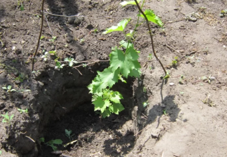 Voordat u gaat planten, moet u overwegen aan welke kant de ondersteuning voor de struiken zich zal bevinden. Met een helling in deze richting, is het noodzakelijk om zaailingen te schikken tijdens het planten. Dus de wijnstok zal zich van nature uitstrekken tot de steun, en daarom zal het gemakkelijker zijn om hem vast te binden.
