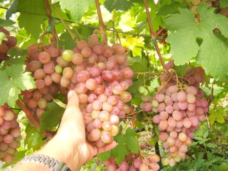 Druiven worden geplukt als ze rijpen - wanneer de kleur dichter bij roze is. Je kunt hele clusters scheuren, ze zijn goed gescheiden van de takken. Bossen worden thuis maximaal 3-4 weken op een koele plaats bewaard. Zonder koelkast op kamertemperatuur liggen rijpe druiven maximaal een week. Je moet de bessen wassen vlak voor consumptie, als de druiven zijn gepland om te worden opgeslagen, kun je het niet wassen.