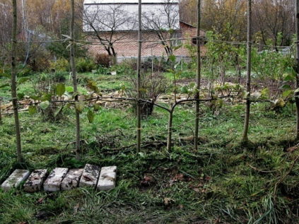 - rijen zijn gerangschikt van oost naar west, latwerkrekken zijn in één vlak uitgerust, struiken bedekken de muren van bijgebouwen of een hek;