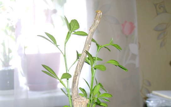 Na het ontkiemen van de spruit wordt het plakband verwijderd en worden de spruiten geleidelijk gewend aan het microklimaat van de kamer, waarbij de verwarmingszak regelmatig wordt verwijderd. Een maand later, wanneer de spruit zich actief begint te ontwikkelen, wordt de oude onderstamstam gesneden.Trimmen moet schuin zijn, 0,3 cm boven de shoot. Om grote verliezen aan sap te voorkomen, moet de snede worden behandeld met tuinvar. Een nieuwe ondersteuning is een kleine ondersteuning voor verticale groei.