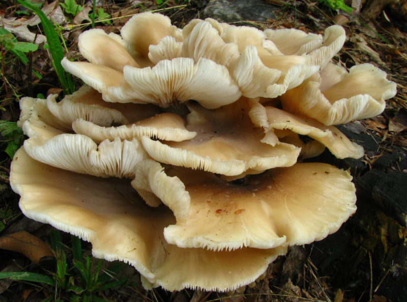 Een andere variëteit is johannesbrood of overvloedige oesterzwammen. Zoals je op de foto kunt zien, is haar hoed crèmekleurig, heeft een concave vorm met golvende randen, verschillende maten - van 3 tot 12 cm. Hij groeit bij voorkeur in loofbossen (berk, eik, iep, lijsterbes).