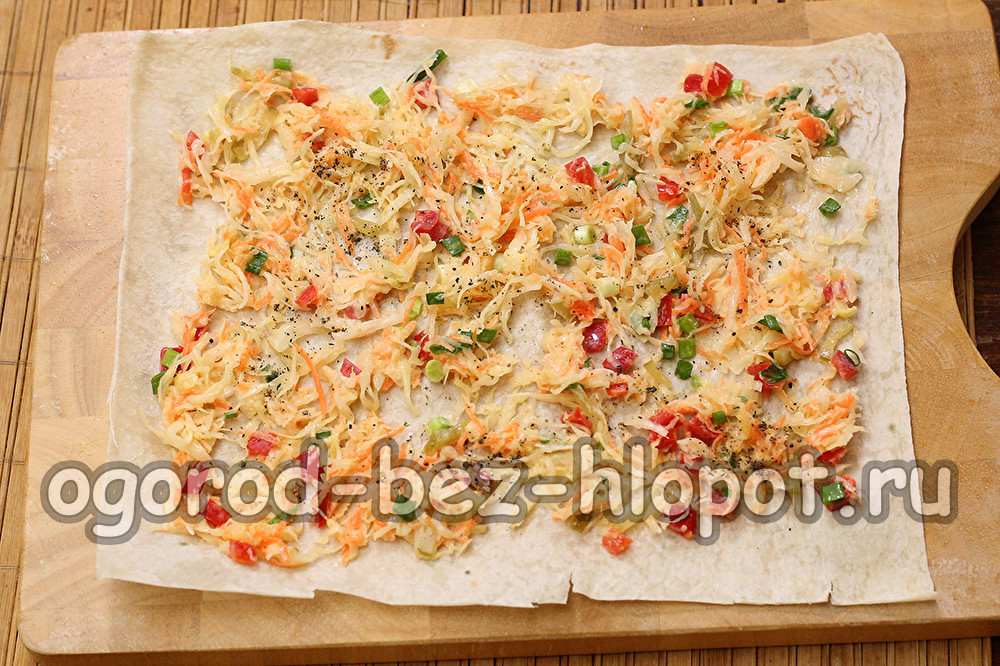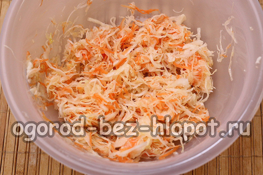 Van groenten heb je verse witte kool, paprika's, wortels en ingelegde of ingemaakte komkommers nodig. Het lijkt misschien dat de komkommer overbodig is, maar de toevoeging van zure komkommer geeft de vulling een ongebruikelijke smaak en het lijkt erop dat de binnenkant geen verse groenten is, maar gestoofde zuurkool. Zeer ongebruikelijk en smakelijk! Maar als deze combinatie je nog steeds stoort, kies dan een groentemix naar keuze. Voeg een beetje mayonaise toe, alleen om de groenten te combineren.