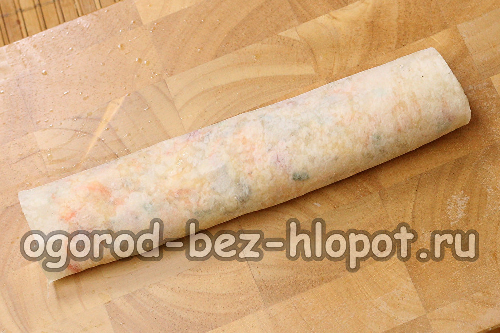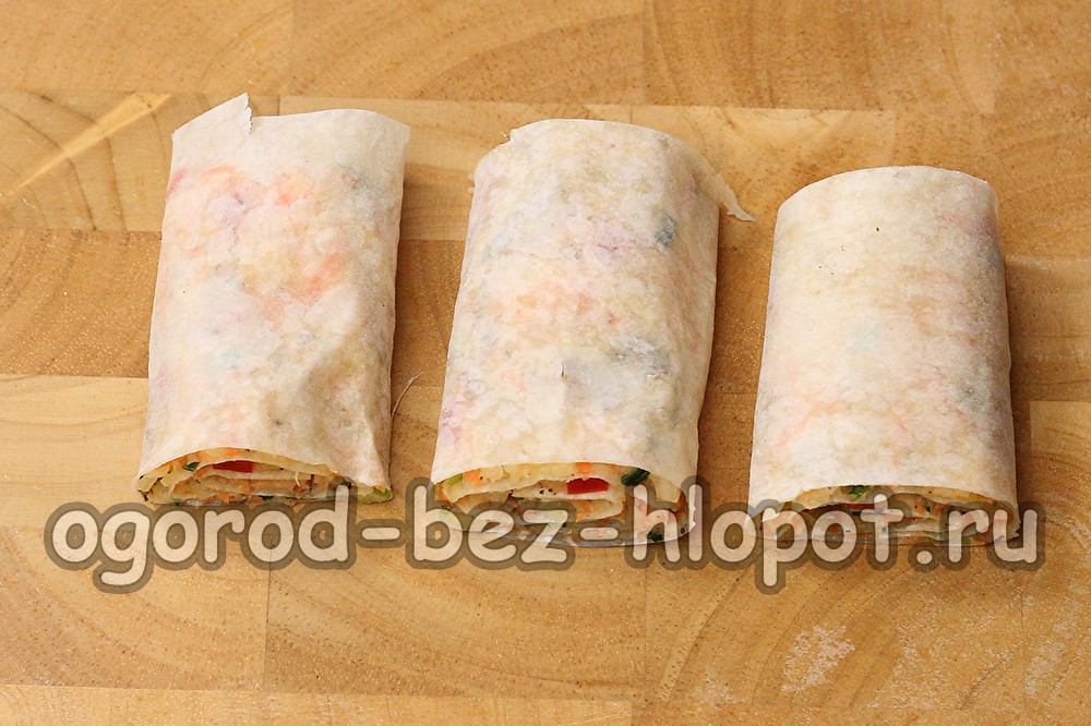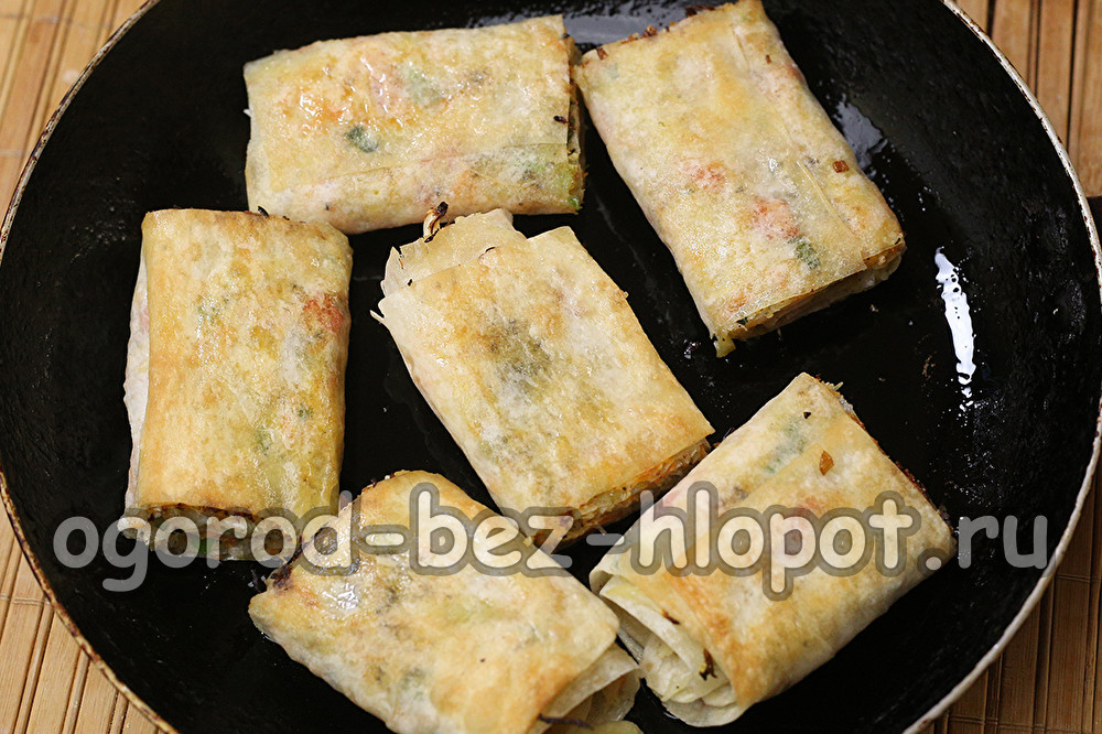 We verwarmen wat olie in een koekenpan, leggen de broodjes en snel bruin. We leggen de naad neer, anders ontvouwen de rollen zich. Draai de rollen aan de andere kant om.