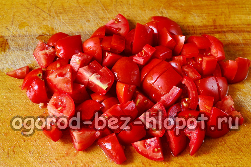 We nemen een ruime pan en vullen deze met de juiste hoeveelheid water. We voegen ook tafelazijn en zonnebloemolie toe. We zetten een pan met deze emulsie op het fornuis en gieten daar gehakte tomaten.