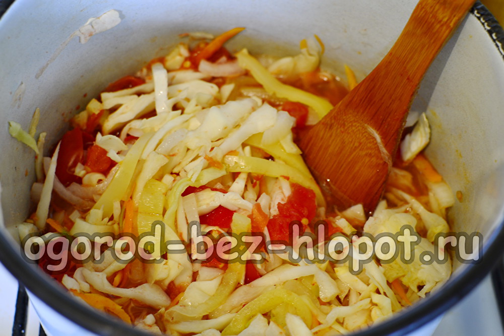 Leg de paprika na een paar minuten koken. Kook opnieuw enkele minuten en giet hier de gesnipperde ui. Nu is de beurt aan het hoofdbestanddeel kool, en daarna leggen we de wortels. Meng de groenten grondig, voeg zout en suiker toe, breng aan de kook en kook nog vijf minuten.