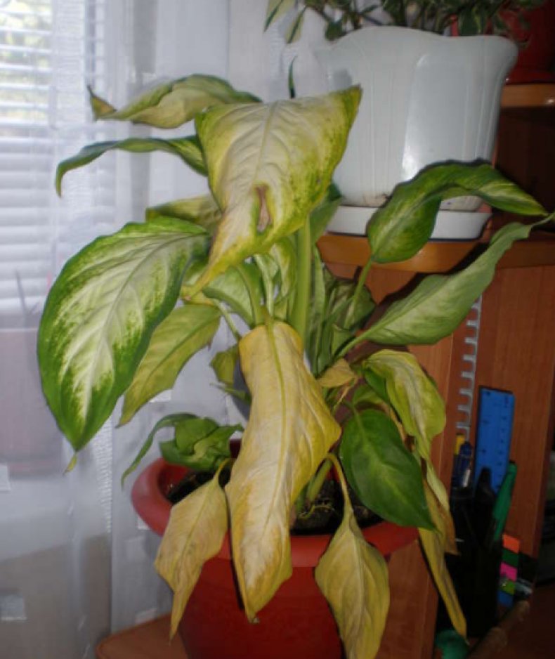 De meest voorkomende moeilijkheid die bloemenkwekers ondervinden bij het kweken van een bloem, is het vergelen van bladplaten. De belangrijkste reden dat bladeren geel worden, is de onjuiste verzorging van dieffenbachia.