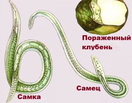 Nematoden zijn helminten die in de grond leven en zich voeden met knollen en wortels. Ze verslinden het ondergrondse deel van de aardappel en doden de plant. Tekenen van het verschijnen van het ongedierte zijn vergeelde kleine bladeren, bruine strepen in de knollen en gezwellen daarop. Als er veel nematoden zijn, moet quarantaine in het gebied worden geïntroduceerd: aardappelen verwijderen, het veld met chemische middelen behandelen en het gedurende minstens 5 jaar niet gebruiken.