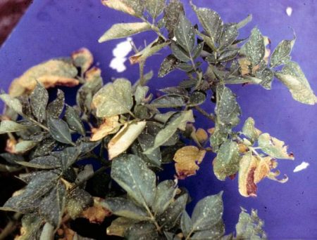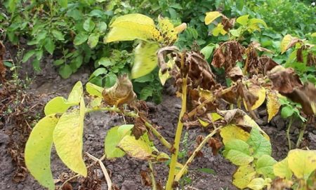 Bij het vergelen van de onderste bladeren van de struik, is het de moeite waard om aandacht te schenken aan de staat van de bladeren. Als hun randen donker zijn en er een pluizige laag is gevormd aan de onderkant - is de aardappel hoogstwaarschijnlijk ziek met late ziekte. Deze ziekte leidt tot volledige vergeling van de struik, waardoor het aantal en de grootte van de knollen wordt verminderd. Als een ziekte wordt gedetecteerd, moeten de struiken worden behandeld met fungiciden, bijvoorbeeld koperchloride. De meest beschadigde planten kunnen het beste van de site worden verwijderd.