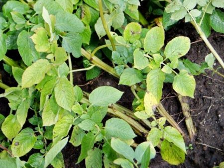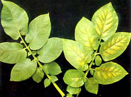 Ook kan de plant geel worden met een gebrek aan ijzer en mangaan. Meststoffen die deze stoffen bevatten, moeten worden geselecteerd en aan de aardappelplantplaatsen worden toegevoegd. Vergeet echter niet dat een teveel aan meststoffen ook het gewas negatief beïnvloedt.