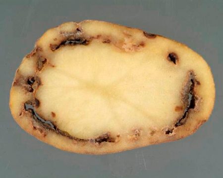 Dunne stengels en bladeren van aardappelen worden geel. Na verloop van tijd drogen ze op en vallen ze af. Om zeker te zijn van de "diagnose", moet u de knol van de aangetaste plant graven en snijden: deze zal bruine of gele ringen hebben die de foetus rond de schil omringen. In een verwaarloosd geval zal de foetus rot zijn en wanneer deze wordt samengedrukt, zal het slijm afscheiden. Alle zieke struiken moeten worden verwijderd en de overige moeten worden gevoed met kali en stikstofmeststoffen.