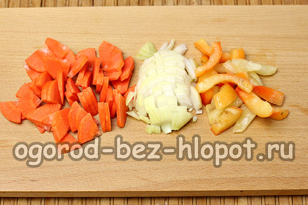In een aparte pan verwarmen we water of bouillon tot het kookt (soep kan worden gekookt op vetarme bouillon van kipfilet of groente). Snijd tijdens het koken de groenten: dunne plakjes wortels, een kleine kubus van ui en rietjes, paprika.