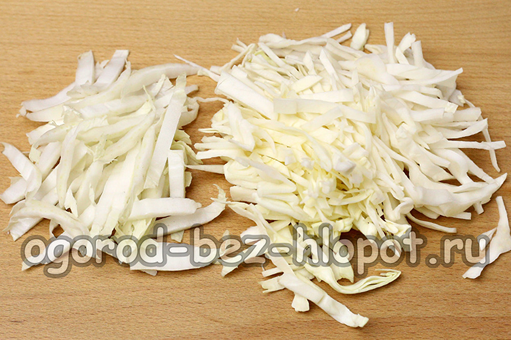 Van de kop van Beijing-kool verwijderen we verschillende bovenste bladeren. Snijd het onderste dichte deel af voor de soep, laat de bovenkant voor salades. We snijden de Beijing in reepjes. We versnipperen witte kool zoals gewoonlijk voor de eerste gangen.
