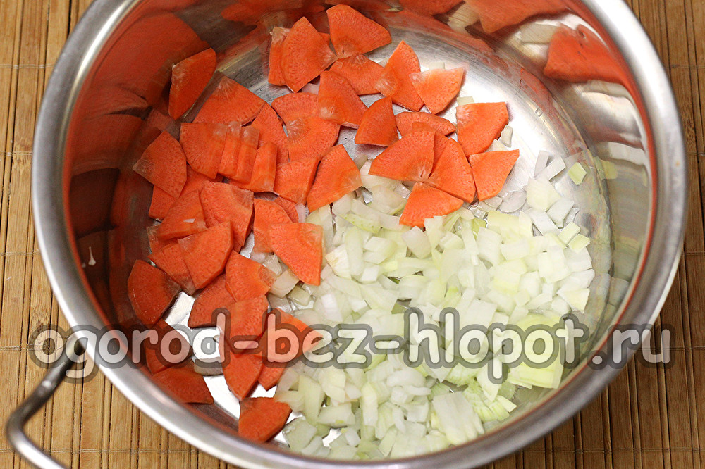 Giet een beetje olie in een pot met een zware bodem - gewoon om de bodem in te vetten. Warmte, verspreid uien en wortelen. Passeren zonder frituren gedurende twee tot drie minuten. Het vuur is bijna minimaal.