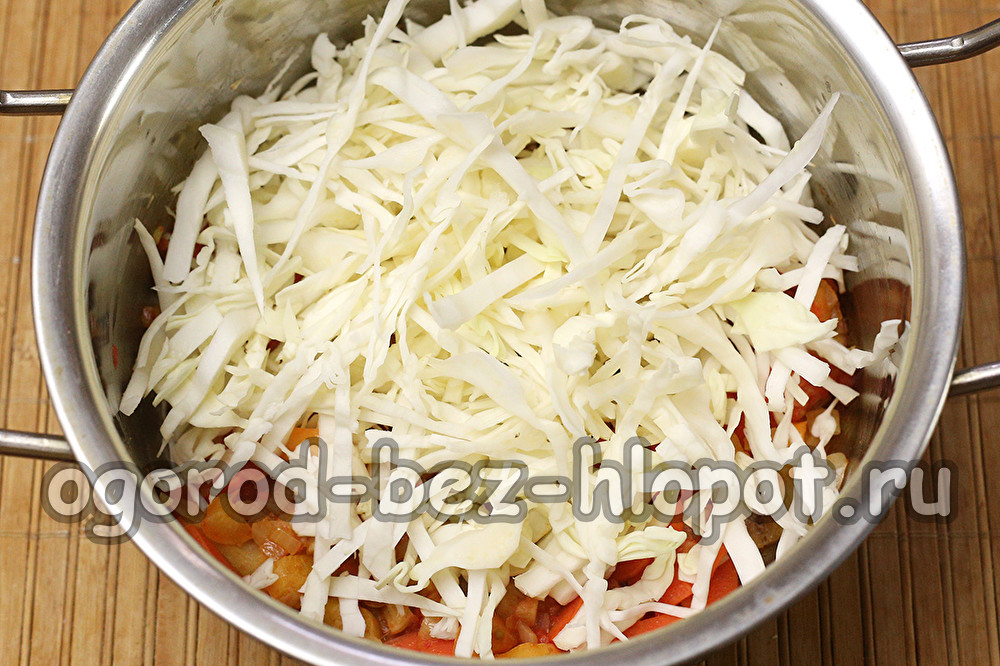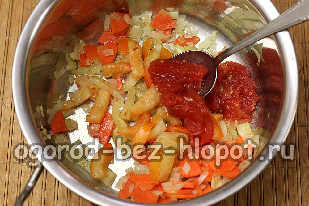 Zodra het karakteristieke aroma van gebakken ui verschijnt en het licht van kleur verandert (doorschijnend wordt), voeg de rietjes peper en tomaten toe. Als we koken met tomaten in blik, voeg dan wat sap uit een blikje samen met aardappelpuree.