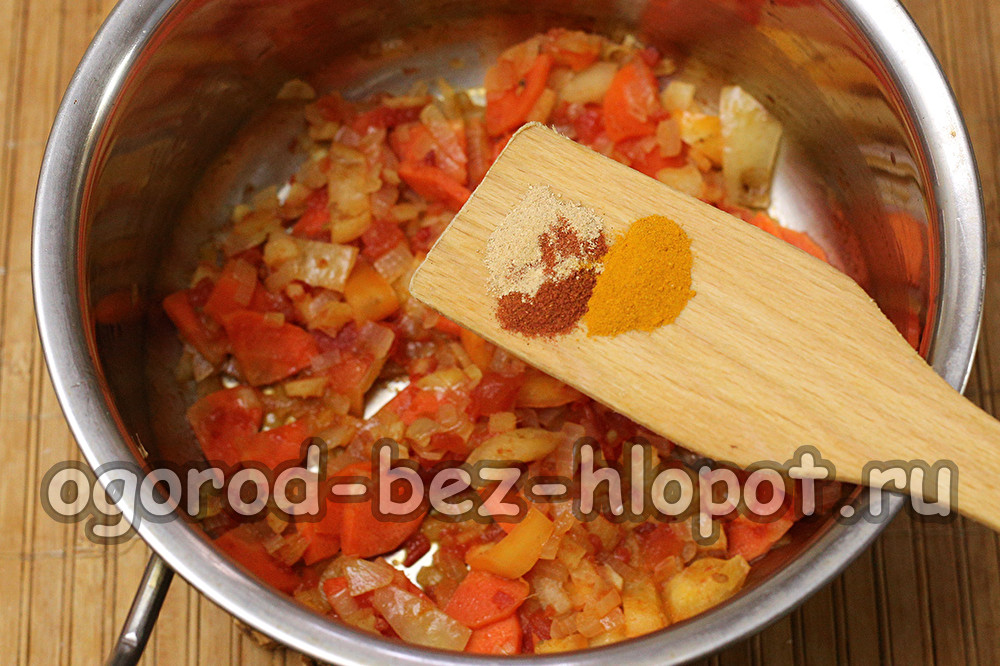 We laten de groenten ongeveer vijf minuten wegkwijnen, zodat de tomaten een zoetzure smaak krijgen. Voeg de kruiden toe. In plaats van gemalen peper en gember, kunt u ringen van verse chili en fijngehakte gemberwortel toevoegen.