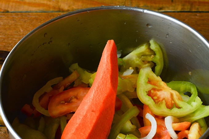 Was de paprika's, verwijder de kern met zaadjes. We snijden. Snijd de schil van de wortel, was deze. Uien reinigen, wassen, in halve ringen snijden. Als uw familie van "vurige" gerechten houdt, kunt u hete pepers in uw billet gebruiken.