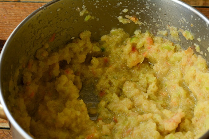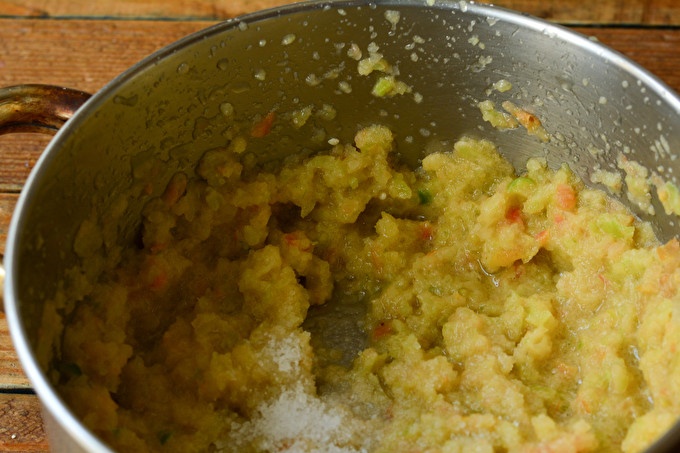 Giet alle groenten in een grote container en hak met een blender. U kunt een vleesmolen gebruiken (gebruik alleen een grote grill). Om het slijpproces sneller te maken en niet gepaard met spatten, moeten alle producten in verschillende stukken worden gesneden.
