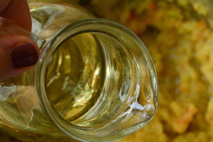 Plantaardig materiaal wordt overgebracht op roestvrij staal of geëmailleerde oppervlakken om het oxidatieproces te voorkomen, dat de smaak van de afgewerkte schaal gemakkelijk kan bederven, en de houdbaarheid van de conservering nadelig kan beïnvloeden. Meng zout, voeg boter toe, voeg suiker toe en meng alles goed.