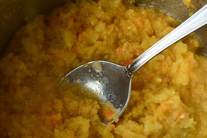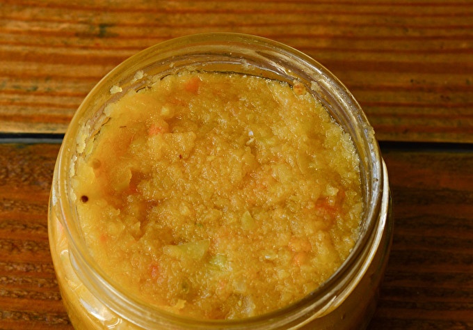Alle groenten in dit recept zijn gedraaid door een vleesmolen en de oogst zelf sluit zonder sterilisatie. Dit is een zeer origineel, kruidig-zuur-zoet gerecht dat je menu diversifieert. Vooral smakelijke kaviaar in combinatie met warme gerechten en vlees.