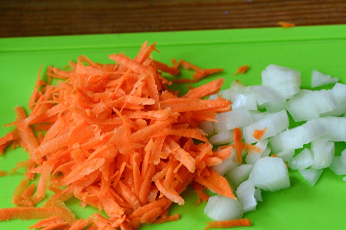 Schil en hak de ui op de snijplank. Schil de wortels en rasp op een rasp of hak ze heel fijn.