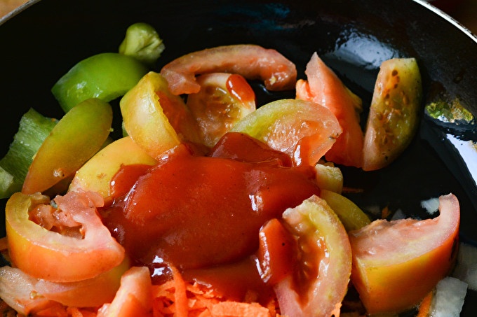 Laat de groenten 2-3 minuten op laag vuur sudderen en leg de tomatenpuree erop. Bedek nu de pan met een deksel en laat de groenten nog 30 minuten sudderen.