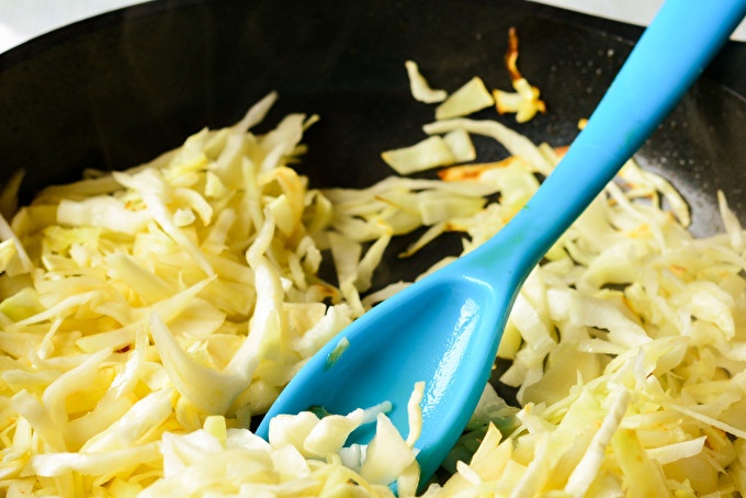 Verhit de pan, doe de kool erin, giet de olie erin en voeg een beetje tot het zacht is. Bij het roosteren van de kool, soms roeren zodat het gelijkmatig kookt. Bak 5-7 minuten. Met deze kookmethode is kool geurig, licht knapperig, maar niet zuur. Het is niet altijd nodig om tomatenpuree aan kool toe te voegen, dus we sluiten het vandaag uit. Tomaat is een amateur-ding, plus het voegt zuur toe aan kool, dat niet iedereen gebruikt. Na het roosteren van de kool afkoelen tot kamertemperatuur. Het is het beste om het van de pan naar een afzonderlijke plaat te brengen.