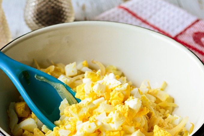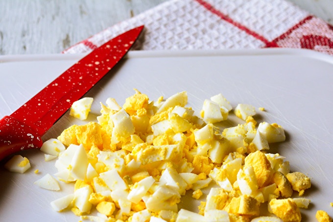 Voorgekookte eieren (kook 7-8 minuten gekookt) schoon en hak: hak met een mes om blokjes te maken.