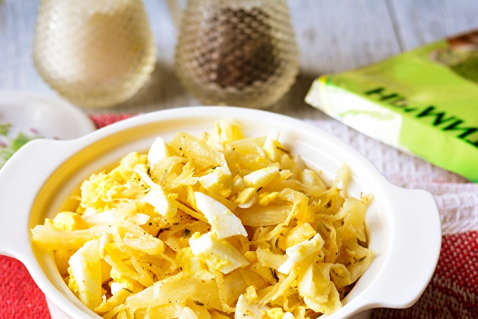 Meng kool en eieren, breng op smaak met zout, een beetje peper. Mix en proef, als er genoeg is, kunt u andere kruiden naar smaak toevoegen.