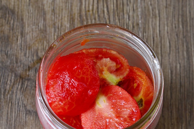 Na het uitvoeren van dergelijke manipulaties zal de huid snel afschilferen. Snijd de gepelde tomaten doormidden en doe ze in potten.
