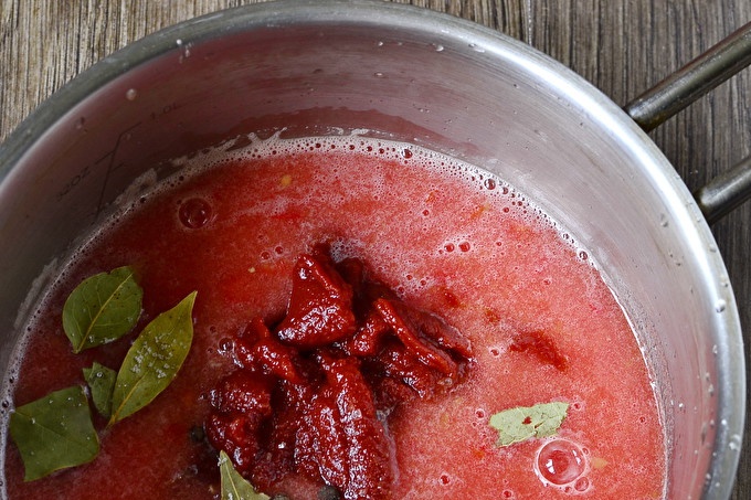 We combineren vers sap met tomatenpuree, zout, suiker, peperkorrels en laurier. Voeg een stuk hete chilipeper en een teentje knoflook toe.