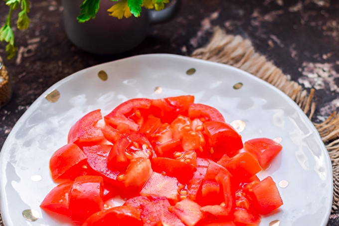 Bereid alle producten op de lijst voor. Neem een bord waarop de salade zal worden verzameld. Was tomaten en droog, snijd ze in blokjes. Sap met tomaten uitlekken, leg tomaten in de eerste laag in de salade.