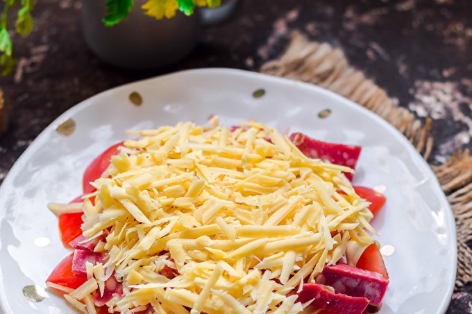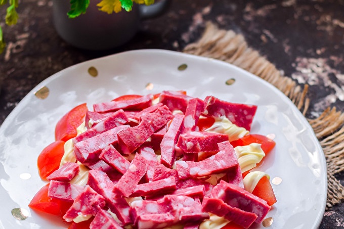 Naast aardappelen maken tomaten, smakelijke worst en harde kaas deel uit van de salade. De salade blijkt ongeëvenaard - van binnen is het ongelooflijk sappig en zacht, maar bovenop de knapperige aardappelen maakt de salade gewoon perfect. Serveer deze salade op de feesttafel. Bekijk ons stapsgewijze recept met foto's.