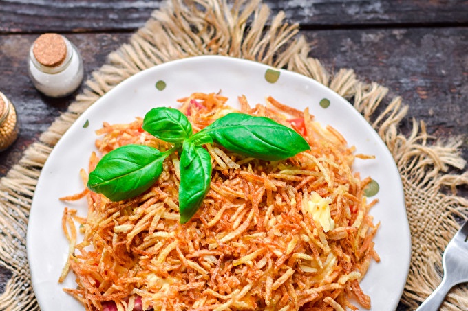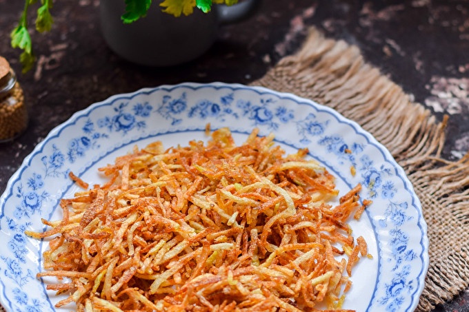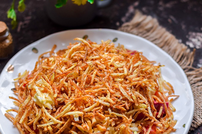 De originele, sappige en gewoon heerlijke salade "Blonde" met gebakken aardappelen zal niemand onverschillig laten. De hoofdingrediënten van deze salade zijn aardappelen. Om een dun rietje aardappelen te koken, moet het worden geschild en geraspt op Koreaanse wortelrasp. Nadat de aardappelen in diep vet bakken. Verwijder overtollige olie van aardappelen met keukenpapier. Koop op verzoek kant-en-klare aardappelen in de supermarkt. Als u een kant-en-klare versie koopt, kunt u met elke smaak kiezen.