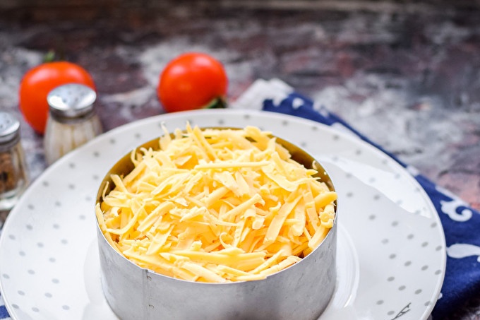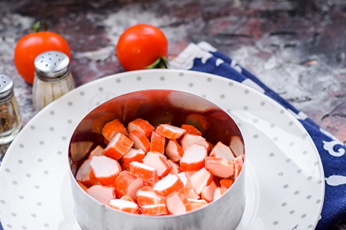 Bereid alle benodigde ingrediënten op de lijst voor. Neem een deel van de plaat, zet de culinaire ring in het midden. Was tomaten, droog, snijd ze in kleine blokjes. Tomaten kunnen 10 minuten in een zeef worden gedaan om overtollig sap te stapelen. Leg het snijden van tomaten eerste laag.