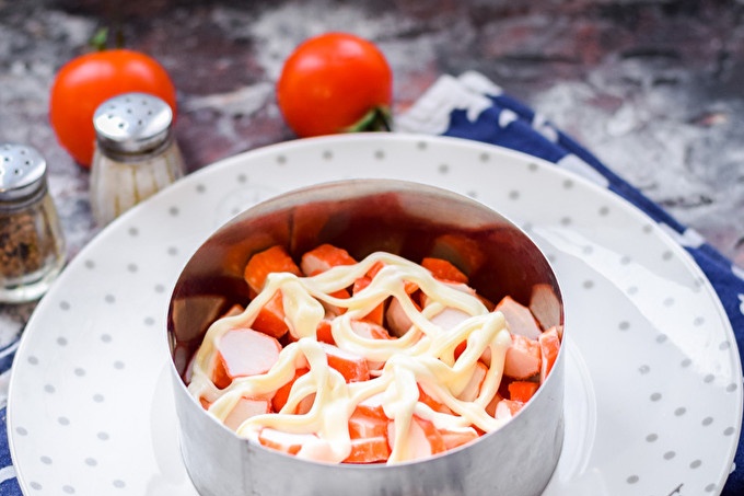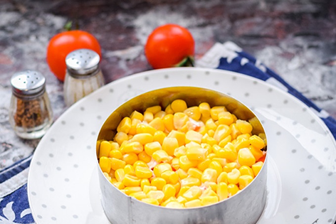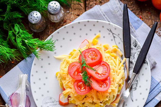 Voeg naast tomaten en krabsticks aan de salade zoete ingeblikte maïs, smakelijke harde kaas toe. Je moet de salade op smaak brengen met mayonaise, maar een mengsel van zure room en mosterd geeft ook een goed resultaat, zelfs af en toe dieet. Serveer de salade op tafel is beter niet meteen, maar na een uur, zodat alle lagen doorweekt zijn.