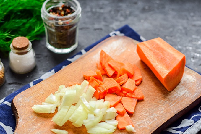 Bereid alle producten op de lijst voor. Schil de uien en wortels, spoel en droog de groenten. Snijd de wortels in kleine stukjes, snijd de ui in kleine blokjes.