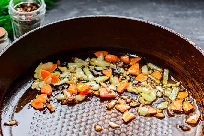 Warm plantaardige olie op in een koekenpan, gooi uien en wortels. Bak de groenten goed tot ze rozig zijn.