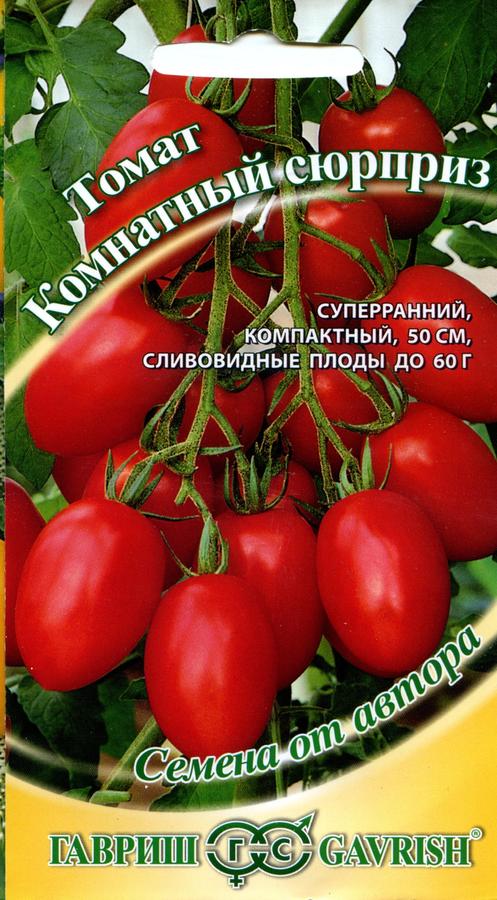Op zoek naar zaden van dit ras in de schappen van zaadwinkels, zie je zakken met de naam "Room surprise" van "Gavrish", maar op de foto zijn mooie kleine tomaten ovaal, pruimvormig en wordt het gewicht aangegeven tot 60 g.