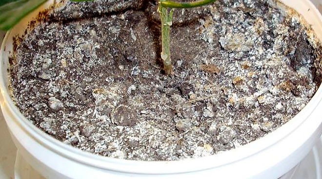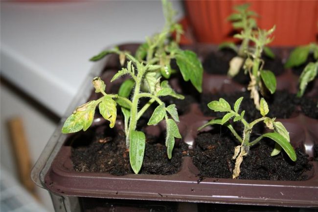 Wanneer we worden geconfronteerd met verzuring van de grond, wat zich manifesteert in het drogen van de top, vergeling aan de randen van het gebladerte en de vorming van een lichte afzetting op de grond, is het noodzakelijk om snelle maatregelen te nemen om de dood van de spruiten te elimineren. In dit geval kan de plant het vocht en nuttige sporenelementen uit de grond niet volledig opnemen, het wortelsysteem begint te voeden ten koste van het luchtgedeelte van de zaailingen. De reden is een teveel aan vocht bij het besproeien met water dat onzuiverheden en chloor bevat of een teveel aan meststoffen.